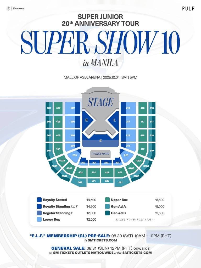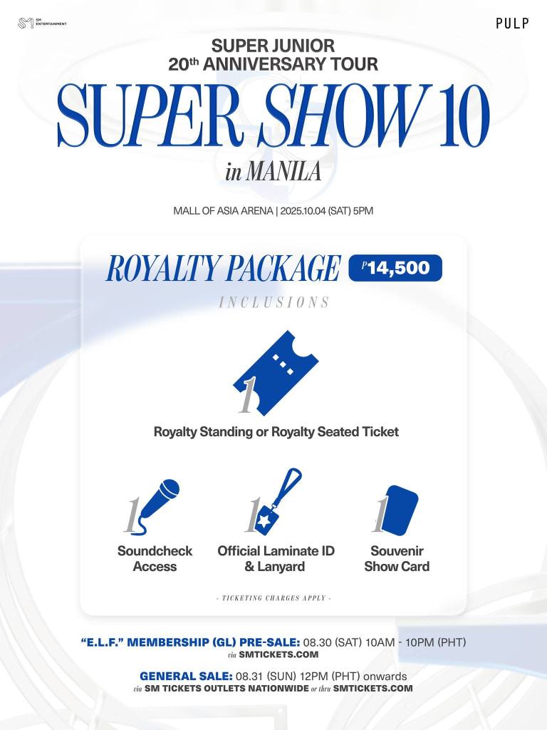 Tickets for SUPER JUNIOR 20th Anniversary TOUR <SUPER SHOW 10> in MANILA will be available first through an exclusive “E.L.F.” Fanclub Presale on August 30, 2025, from 10AM to 10PM PHT, only via smtickets.com. The General Sale will follow on August 31, 2025, starting at 12PM PHT, available at all SM Tickets outlets nationwide and smtickets.com.